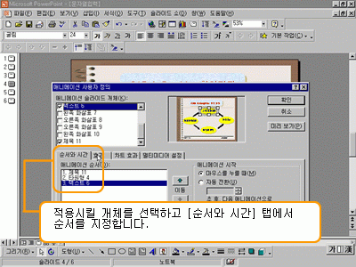 [¾Ö´Ï¸ÞÀÌ¼Ç »ç¿ëÀÚ Á¤ÀÇ] ´ëÈ­ »óÀÚÀÇ [¾Ö´Ï¸ÞÀÌ¼Ç ½½¶óÀÌµå °³Ã¼] Ç׸ñ¿¡¼­ ¾Ö´Ï¸ÞÀ̼ÇÀ» Àû¿ë½Ãų °³Ã¼¸¦ ¼±ÅÃÇϰí, [¼ø¼­¿Í ½Ã°£] ÅÇ¿¡¼­ ¼ø¼­¸¦ ÁöÁ¤ÇÕ´Ï´Ù.